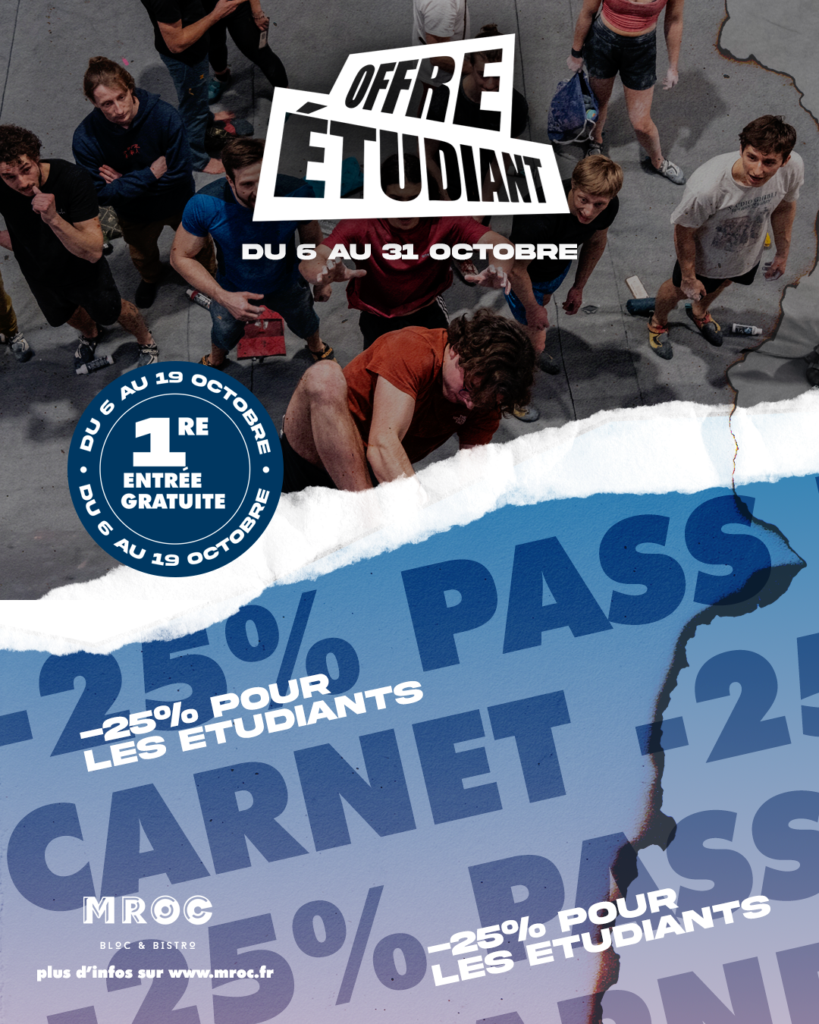 âĄïž La premiĂšre fois que vous venez grimper pendant cette pĂ©riode, votre entrĂ©e est gratuite (matĂ©riel inclus) sans rĂ©servation, sur justificatif Ă©tudiant. Rendez-vous directement en salle MRoc !